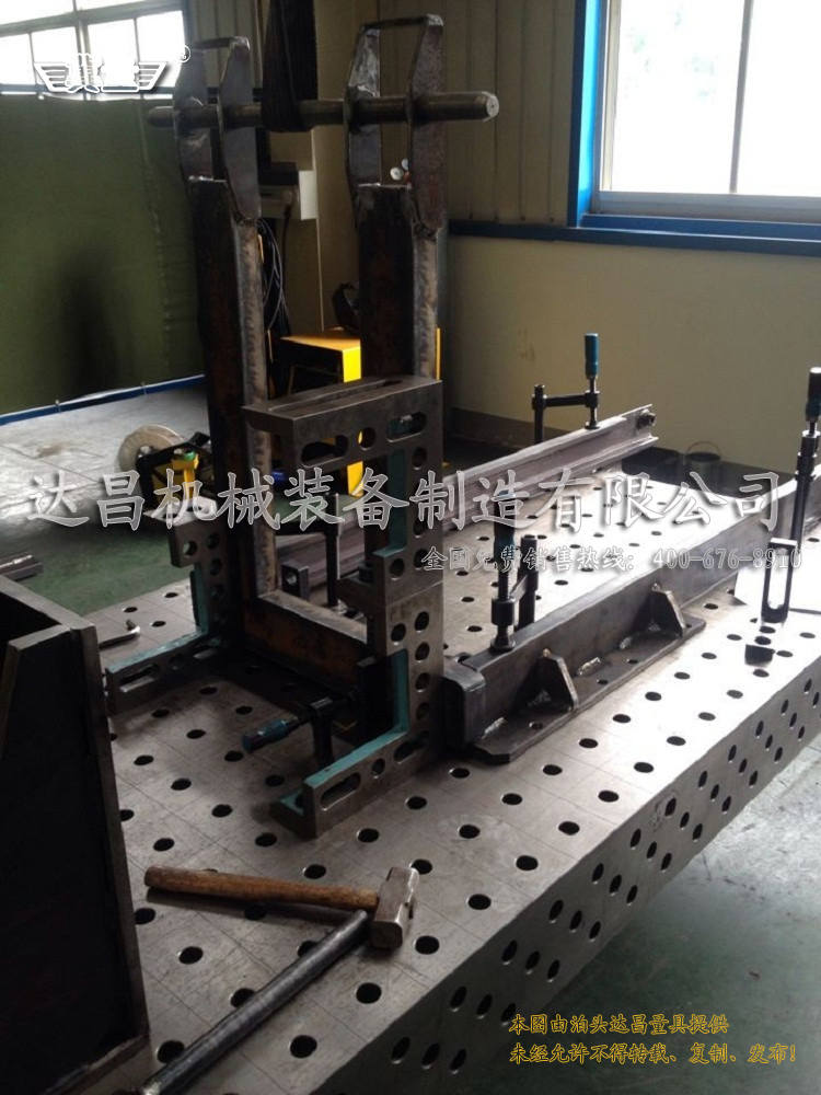 三维柔性焊接基础平台说明:三维柔性焊接工作平台采用带孔格板形式、高精度、标准化、模块化。在高精度的台面的上表面和4个侧面,每隔100mm均布φ28mm的圆孔(D28系列),或每隔50mm均布φ16mm的圆孔(D16系列),并以同样的间隔划有尺寸线,台面边缘可带毫米刻度线,台面上的圆孔可用于拼接各种功能的定位模块和夹具。